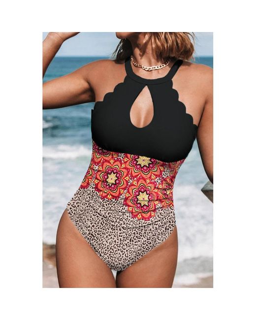 Azura Exchange Halter Neck Scallop Trim Cutout Floral Color Block One Piece Swimsuit In Leopard Red Lyst